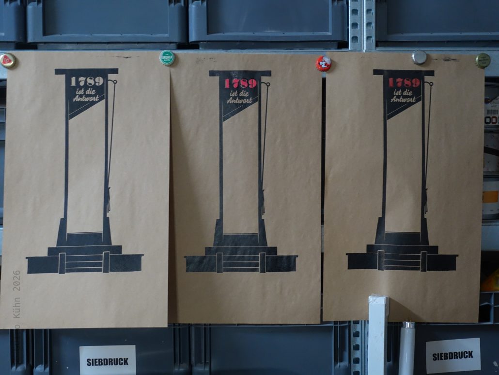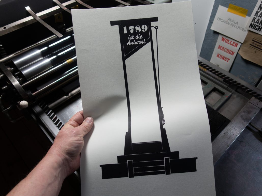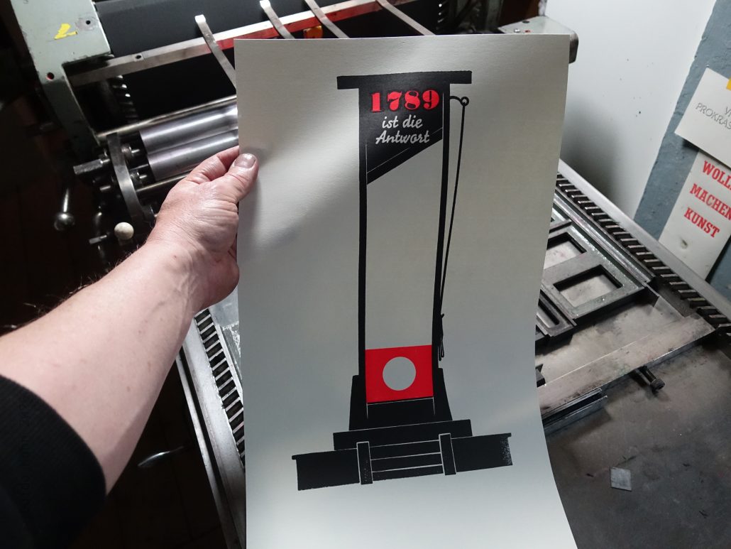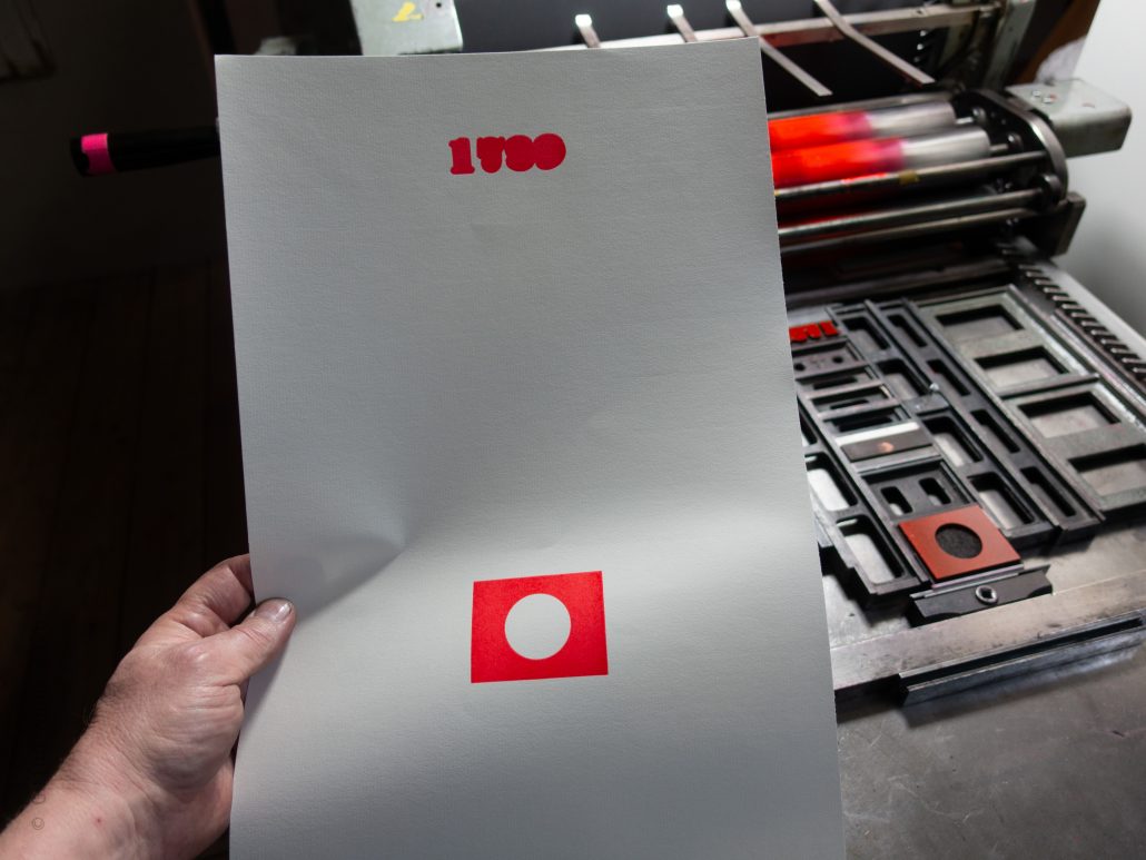 Nachdem die Holzformen geschnitten waren, druckte ich die Rot- und die Schwarzform und testete beide auf verschiedenen Papieren hinsichtlich Farbe und Passer. Um es mir leichter zu machen habe ich die Rotformen teilweise vergrößert gedruckt, da mit schwarz überdruckt wird und der dabei anstehende Glanzhof nach dem Wegschlagen der Farbe verschwindet. Am Ende entschied ich mich für Pantone 812, ein sehr grelles Rot, das auf dem beigen Papier jedoch für meinen Geschmack ausgesprochen gut wirkt.