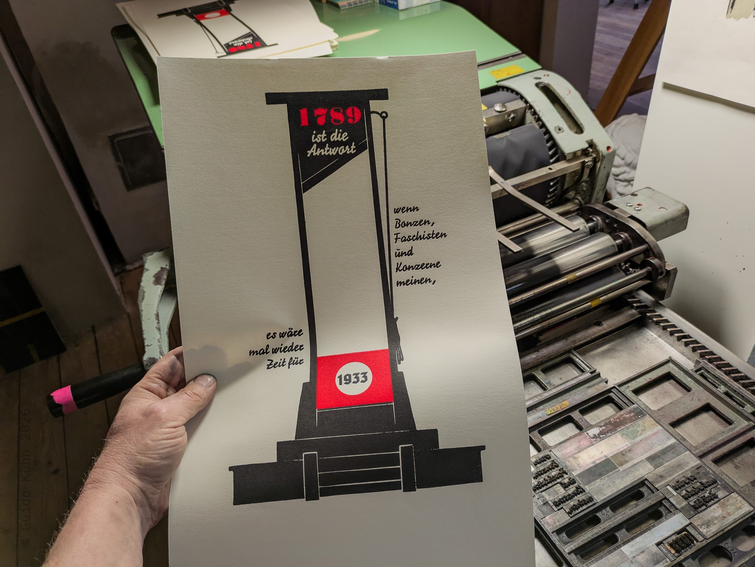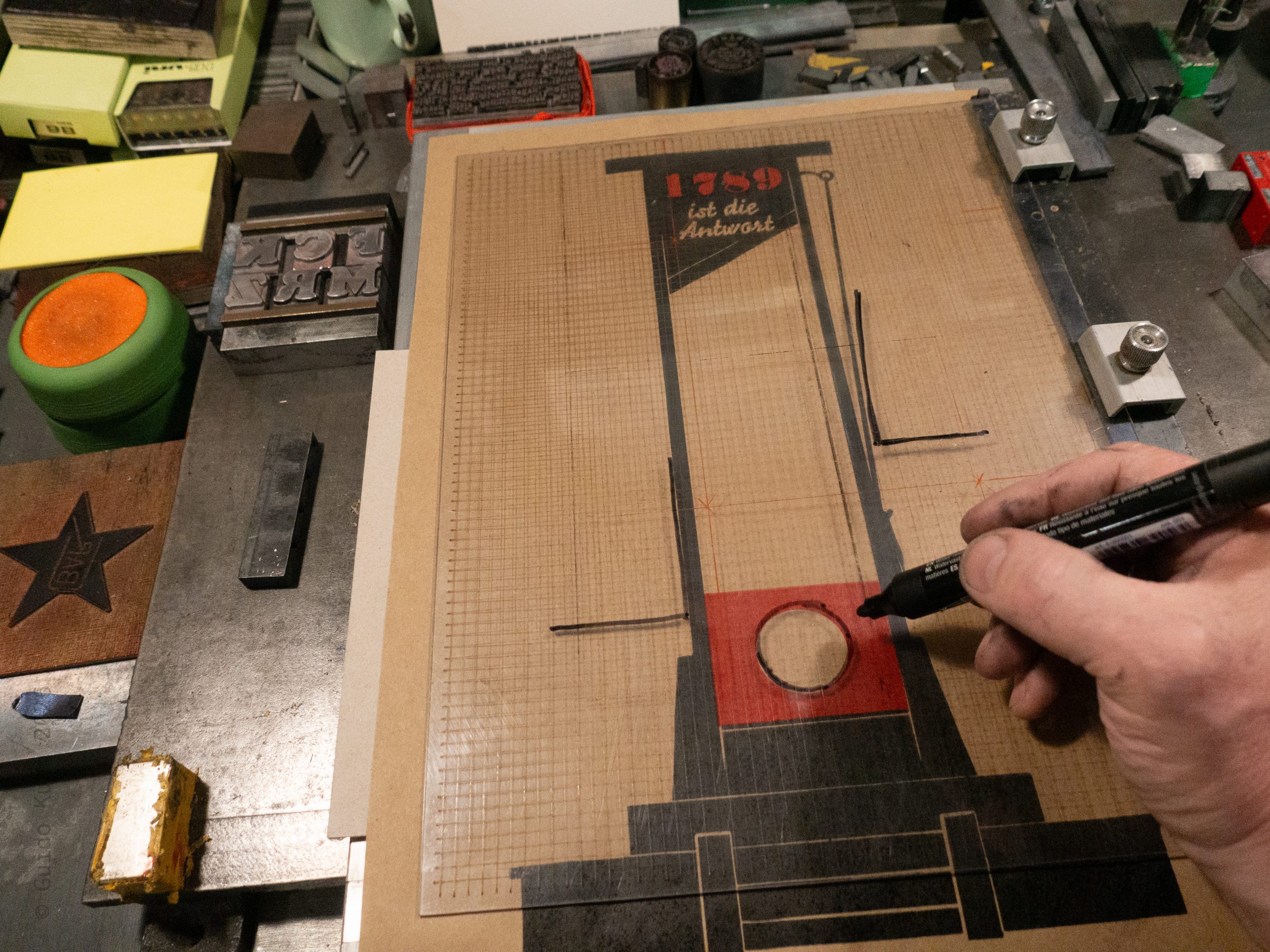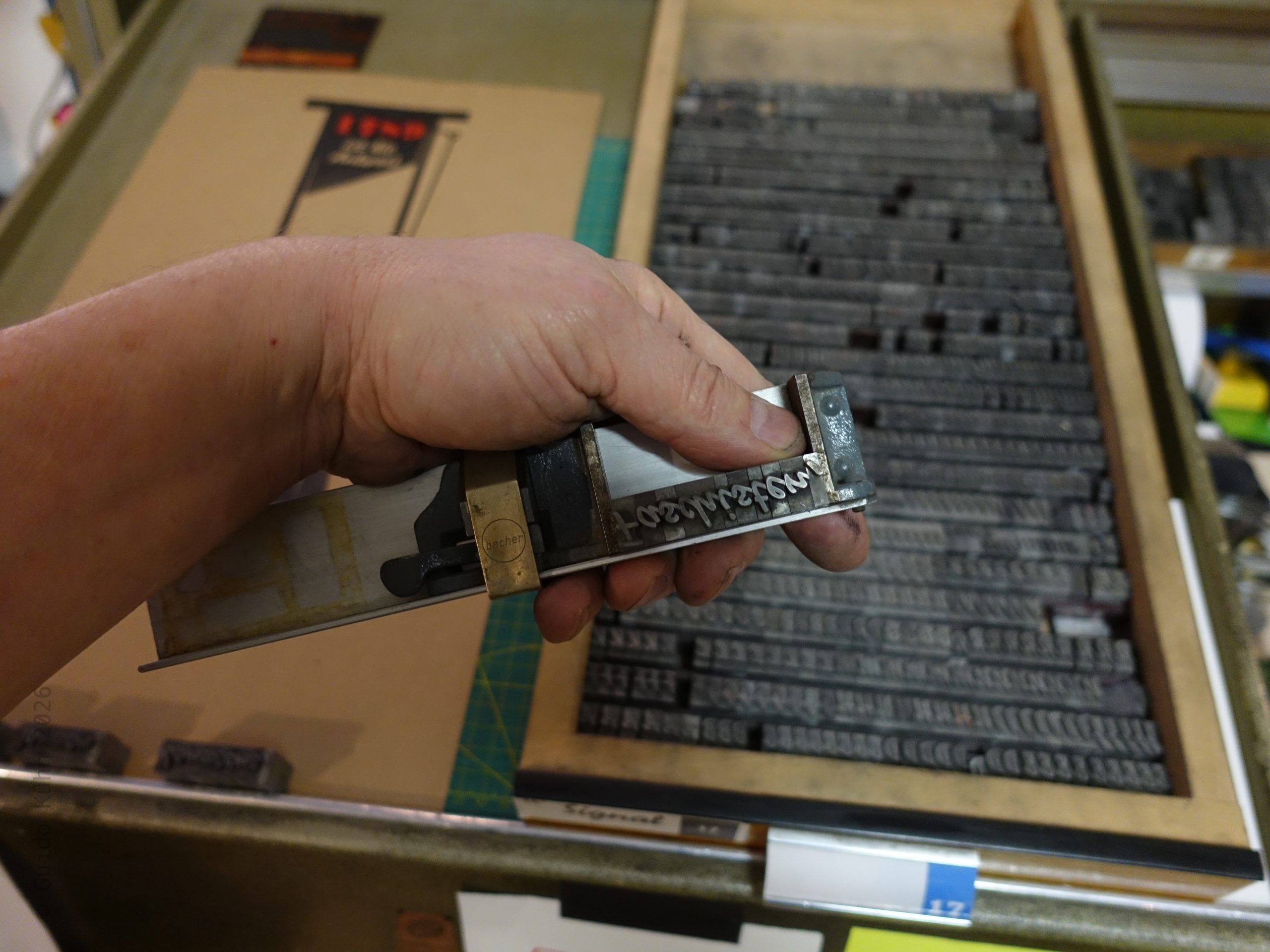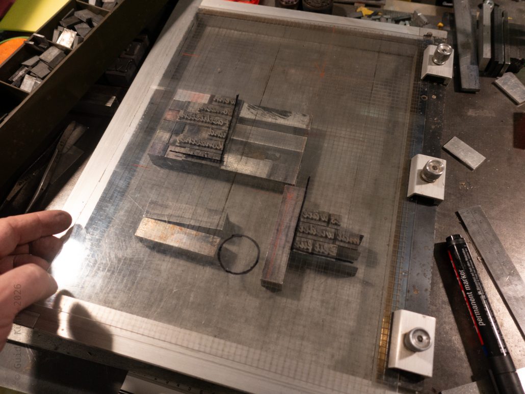 Anschließend folgte der Bleisatz, denn das Plakat benötigte noch weitere Schrift. Dabei kam eines meiner ungemein praktischen Bacher‑Montageschiffe zum Einsatz, da ich hier nicht nur den Stand, sondern auch die Form berücksichtigen musste. Das Schiff besitzt einen Makrolon-Deckel mit Cicero‑Einteilung. Mit einem Marker übertrage ich die relevanten Formen auf diesen Deckel und kann so die einzelnen Schriftgruppen bereits im Satz nahezu exakt arrangieren.