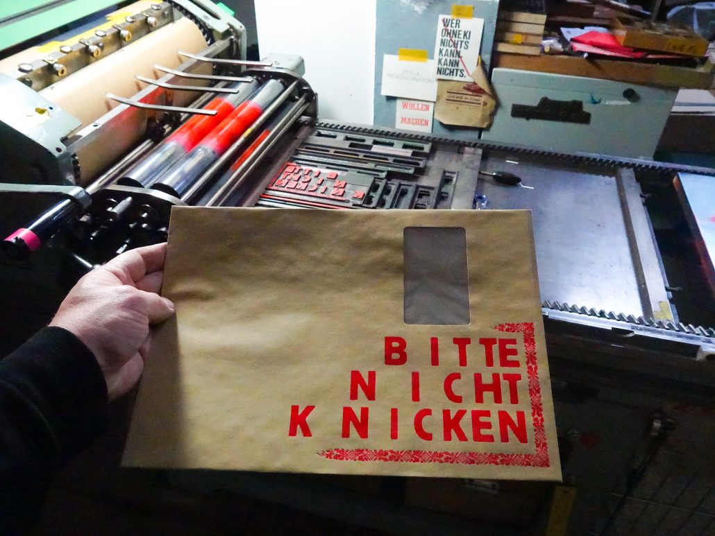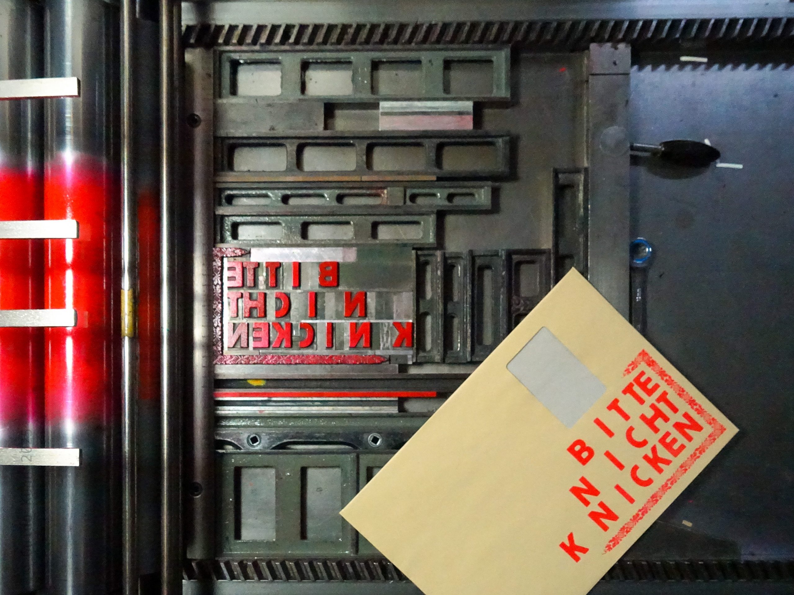 Die Versandtaschen waren wieder mal ausgegangen und damit Anlass für eine neue Variante, der immer wieder neu gesetzten „Bitte nicht knicken“-Spielerei: Die Block in 72p und etwas vom langen Arbeitsleben gut gebrauchter, bestimmt 120 Jahre alter Schmuck taten diesmal den Job. Ich mag ja wie das Pantone 812 Leuchtrot auf den C4 Manila-Umschlägen steht. Und was ich ebenfalls sehr mag ist der Cardio-Flow an der Korrex Hannover. Diese erfordert in der Benutzung einen fließenden rechts/links Wechsel der Kurbel-, An- und Ablagehand, dieweil man an der Maschine stehend einen Halbschritt nach links und wieder nach rechts macht – richtig ausgeführt stoppt der händisch betriebene schwere Zylinderwagen bis auf den Richtungswechsel an keiner Stelle seiner oszillierenden Hin- und Herfahrt über Druckstock und Fundament. Nur dass das Farbwerk je nach Farbauftrag etwa alle 15-50 Drucke etwas Nachschub an Farbe will stört heute den Flow des Druckers, was man früher mit einem dienstbaren, farbnachführenden Stift, einem Lehrling löste.