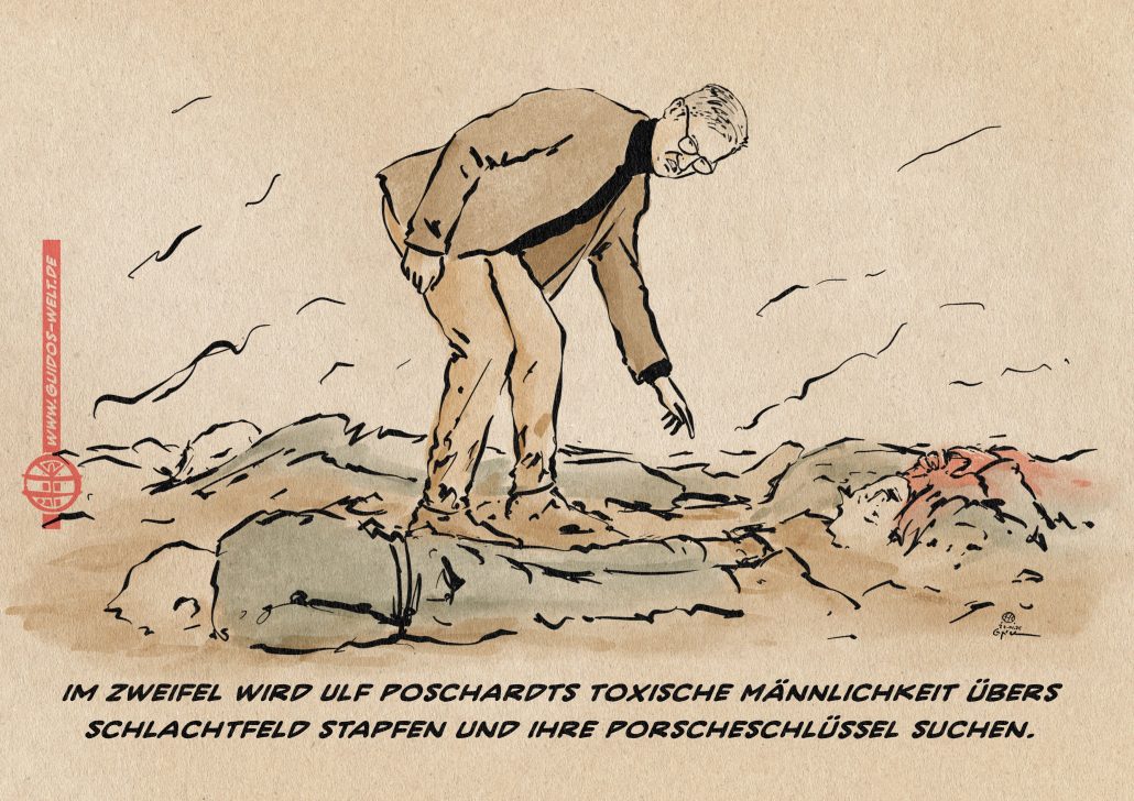 Mit dem Take „Im Kriegsfall wird es die toxische Männlichkeit sein, die dieses Land verteidigt“ überhöht der männliche Toxikologe Ulf Poschardt seine fragile Männlichkeit nicht nur zur Bestimmung, sondern unterschlägt, dass Kriege im Kern noch immer in toxischer Männlichkeit ihren Ausgang haben.