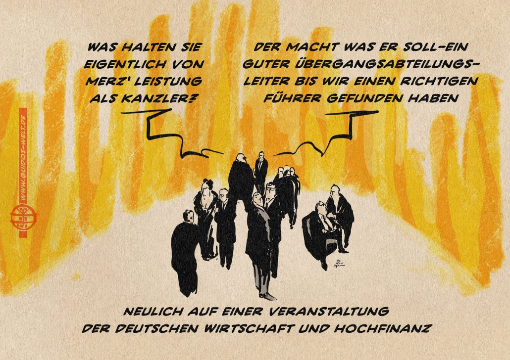 Union und AfD liegen nun gleichauf. Das ist kein Unfall, sondern Programm. Während die Union durch ihre Schwerpunktsetzungen Authoritarismus und Nazis legitimierte und groß machte, kopierte sie ihre politischen Inhalte nicht nur von der AfD, sondern auch wortgetreu(sic!) von den Energieriesen(1), von der Autoindustrie(2), von der Chemie- und Metallindustrie(3). Die Regierung Merz übersetzte bisher Politik damit, sich als Co-Working-Space für Wirtschaftsinteressen zu begreifen, in welchem sie angestrengt überlegt, Wirtschaftshemmnisse wie Soziales und Infrastruktur, dort wo man sie nicht gleich ganz abschaffen kann, wenigstens in für private Stakeholder lukrative Profitcenter umzumünzen. Sie ist ein serviles Outlet einer neoliberalen Clique aus Industrie und Hochfinanz, welche mittlerweile gute Teile der Medien kontrolliert und den Staat gemessen an ihrer Freundlichkeit zum braunen Sumpf, fraglos gerne wieder autoritär führen würde.