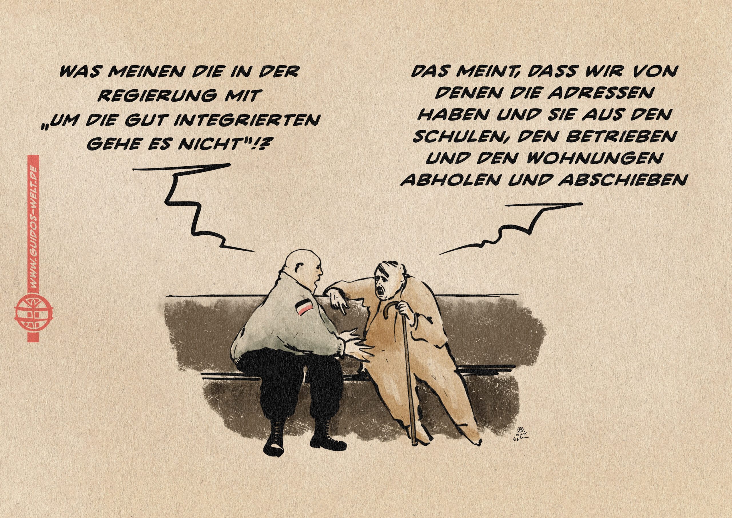 Kein Tag vergeht, ohne dass jemand in Ausbildung, in der Schule, im Beruf – eben jemand, der gut integriert ist, aus dem Beruf, der Ausbildung, der Familie, dem Leben herausgerissen und abgeschoben worden ist. Es ist das servile wie selbstaufgebende Anbiedern eines Systems an seinen braunen Rand. Und eine erfolglose Selbstaufgabe obendrein, denn der braune Rand sieht in dieser anbiedernden Selbstaufgabe gleichermaßen Bestätigung und Schwäche – Nie wird man den braunen Rand solchermaßen in die Mitte zurückholen, wohl aber übergibt man dergestalt das Land dem braunen Rand.