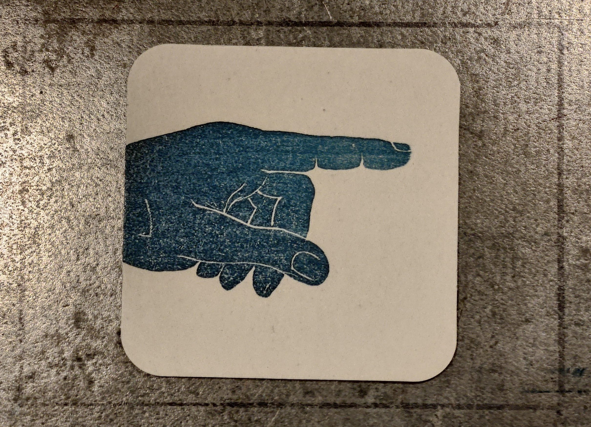 Eine etwa 120 Jahre alte, in Holz geschnitzte Zeigerhand. Ohne den Fingerzeig waren um die Jahrhundertwende profane Werbezettel und Plakate kaum denkbar. Gab es keine passende Hand, schnitzten sich die Setzer selbst eine, wie diese hier. Etwas zu grob in der Ausfertigung für ein Industrieprodukt, aber gerade daraus und aus seinen Lebensspuren bezieht diese Druckform ihren Reiz.