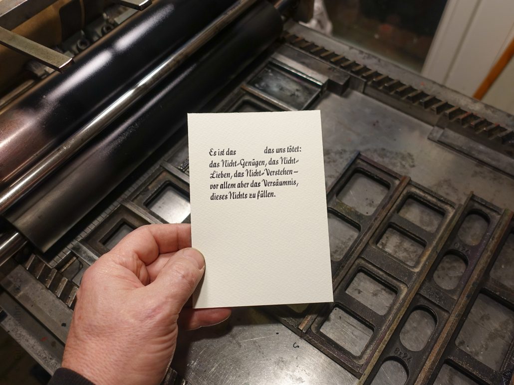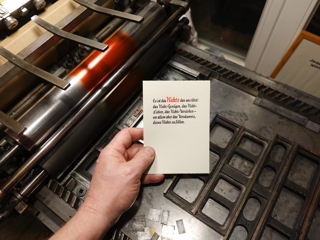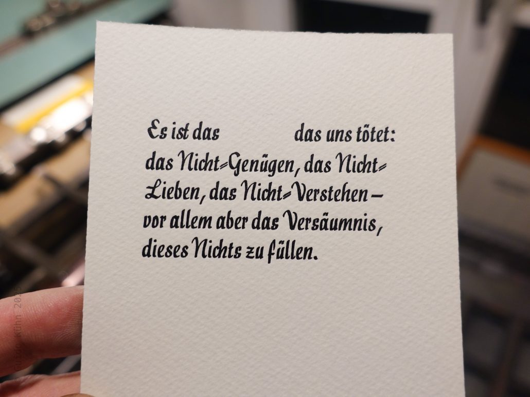 Nachtrag: einen Tag später hatte ich abends nochmal Zeit den Satz fertig zu setzen und auf der kleinen Zylinderpresse, der Korrex Stuttgart, zu drucken. Neben der Interpunktionskorrektur langsamer Puzzlekram, wie ich ihn mag: Eine st Ligatur habe ich nach einigem Hin- und her aus optischen Gründen auflöst, weil sie im Wort zu eng stand. Und dann habe ich noch alle Arten der Kommasetzung nach dem ersten Nichts ausprobier, um es dann wegzulassen. Warum? Nun weil da am Ende irgendwie immer „Nichts-Komma“ stand, was mir aber nicht gefiel, weil das Nichts nunmal absolut ist, so wie es Nichts-Komma eben nicht ist. Zum Glück trennt sich der Satz ohnehin auch so durch den Farb- und Schrifthöhenkontrast von alleine, und hey: am Ende muss es zum Glück ausschließlich mir gefallen.