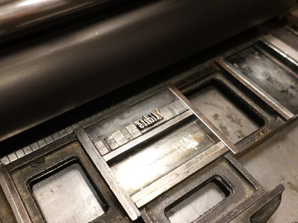 Bleisatz am Abend – Begrüßung einer neuen Schrift in der Setzergasse: der Holla von Klingspor, 1932. Für einen ersten zweifarbigen Probeabzug färbe ich die Form von Hand ein. Das ist nicht perfekt, aber es geht hier nur um die Begutachtung von Satz, Stand und ein erster Eindruck der späteren Farbwirkung. Sagt also Hallo zur Holla.