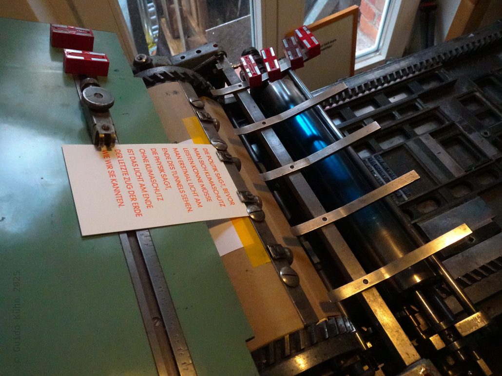 Bereits länger wartete sie, sorgsam verpackt in zwei Graden, auf ihren Einsatz. Nun endlich hat die „Neuzeit“ ihren Platz in der Setzergasse gefunden – und mit ihr die Gelegenheit, sie auch mal druckend zu würdigen. Entworfen 1928 von Arthur Ritze und Wilhelm Pischner für die Schriftgießerei Stempel, verkörpert sie die klare, geometrische Formensprache ihrer Zeit.
