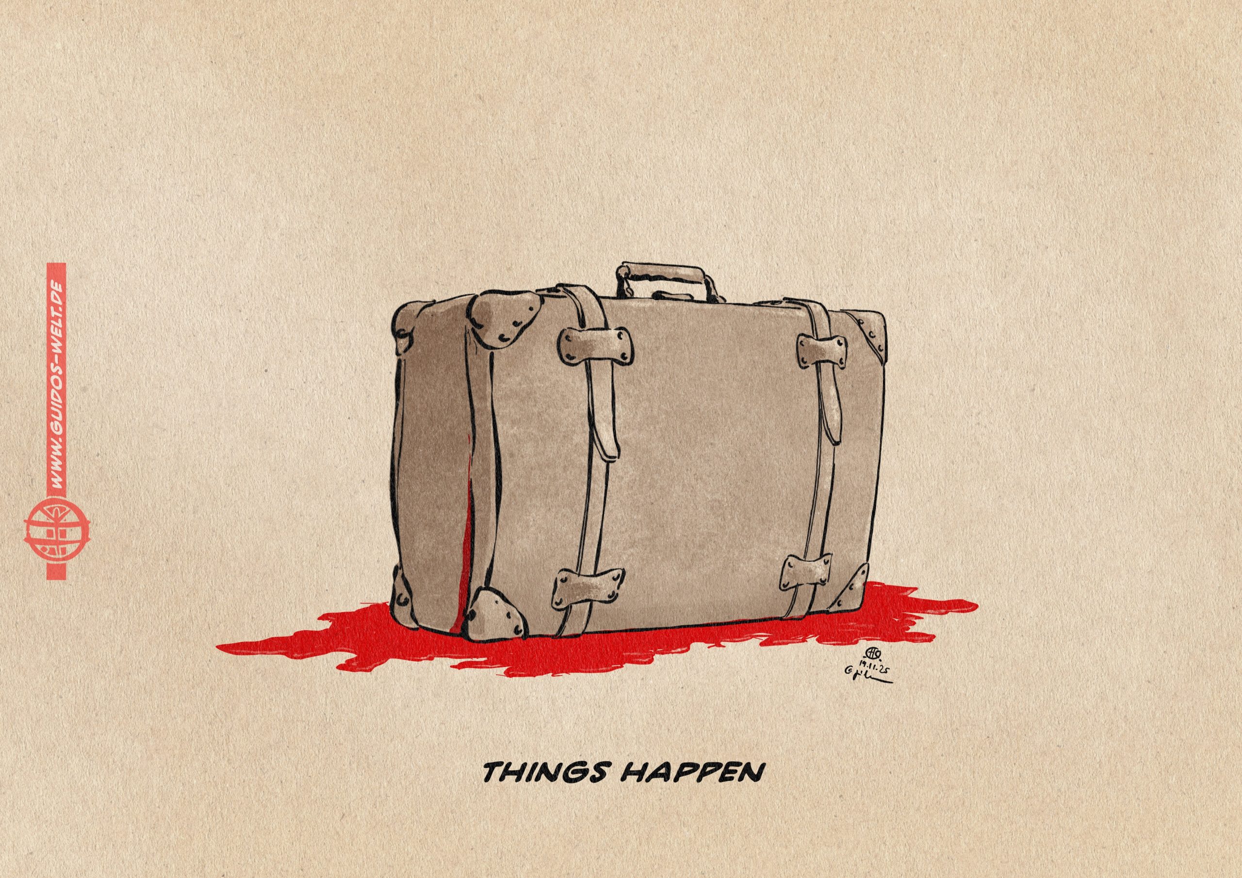 Illustration eines Koffers, der in einer roten Lache steht. Textzeile: Things Happen
