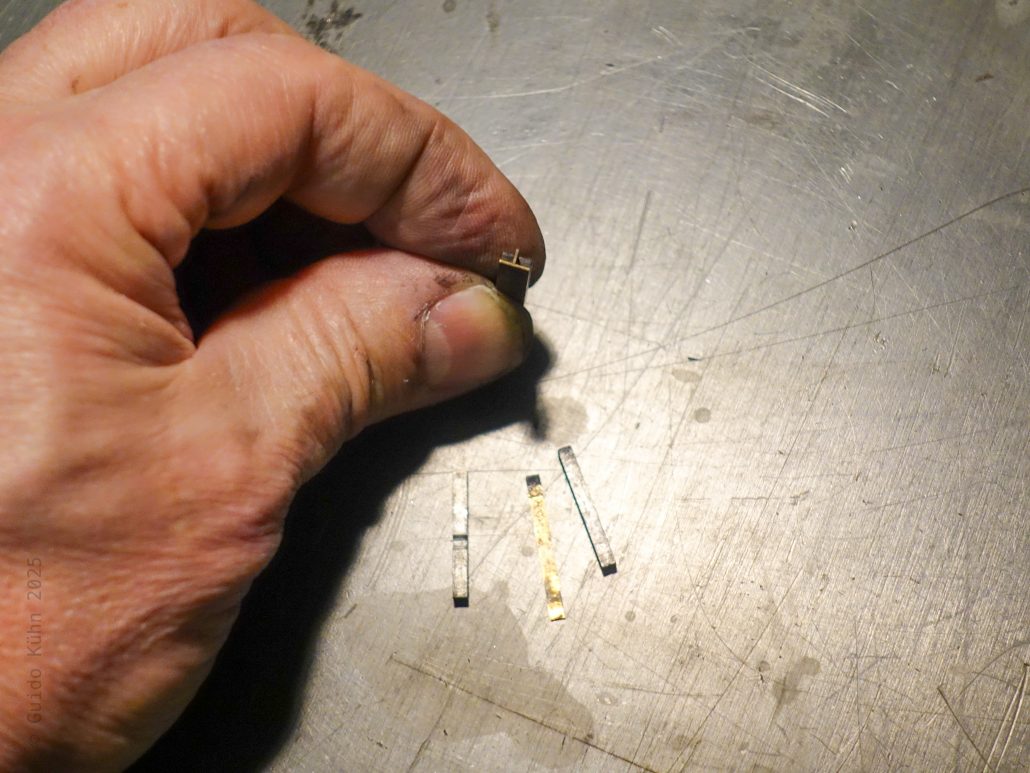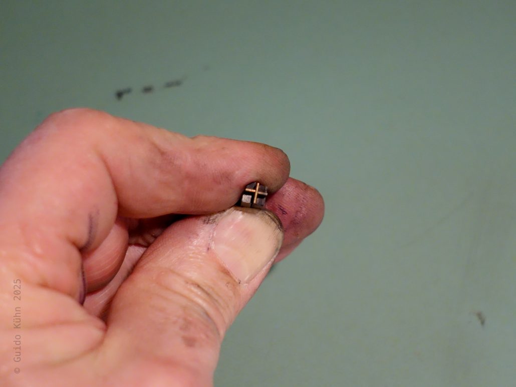 Nun, während die Menschheit weiter die Weltformel sucht, suche ich im Weltenraum meiner Setzerei mal wieder das, was wohl alle Handsetzerinnen immer wieder suchen: ein Plus. Mathematische Operatoren waren nicht Teil der Standardsortierung, in welcher Schriften verkauft wurden, sondern immer gesondert zu erwerben. Daher sind sie heute sehr selten. Gut, daher waren sie auch schon damals selten, weshalb ich tue, was alle Setzerinnen früher oder später mal machen mussten: Ich baue ein Plus aus 1p Linien und 4p Quadraten, was ein echter Fummelkram ist.