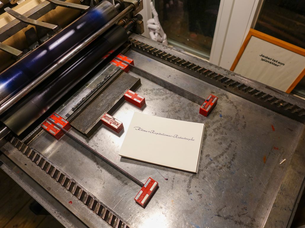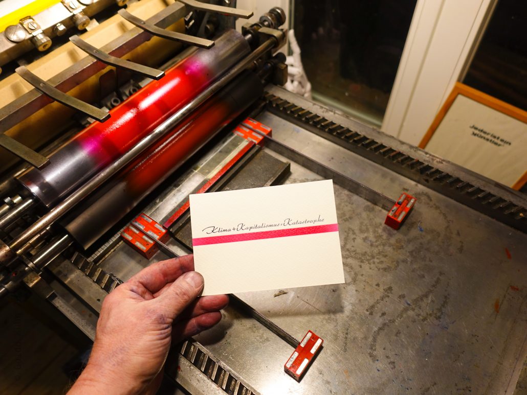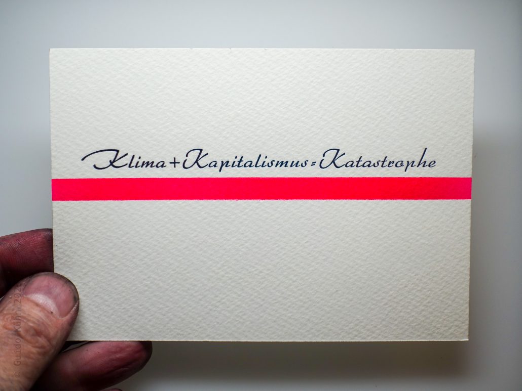 Zur Belohnung drucke ich mit der wirtschaftswunderigen Arabella in 24p in zwei Durchläufen mit einem auf dem strukturiertem Baumwollpapier fast schwarz stehenden HKS 41 Schwarzblau und Pantone 806 einem fluoreszentem Tagesleucht Magenta den aktuellen Stand eines aktuell nicht ganz unbedeutenden Teils der Weltformel, so wie ich ihn mittlerweile als gesichert sehe.